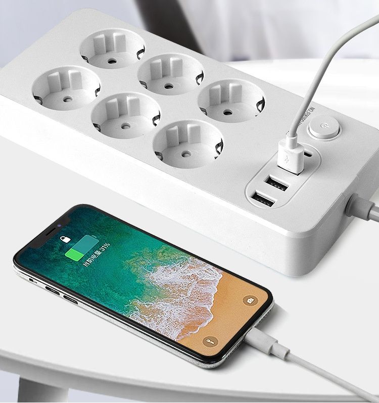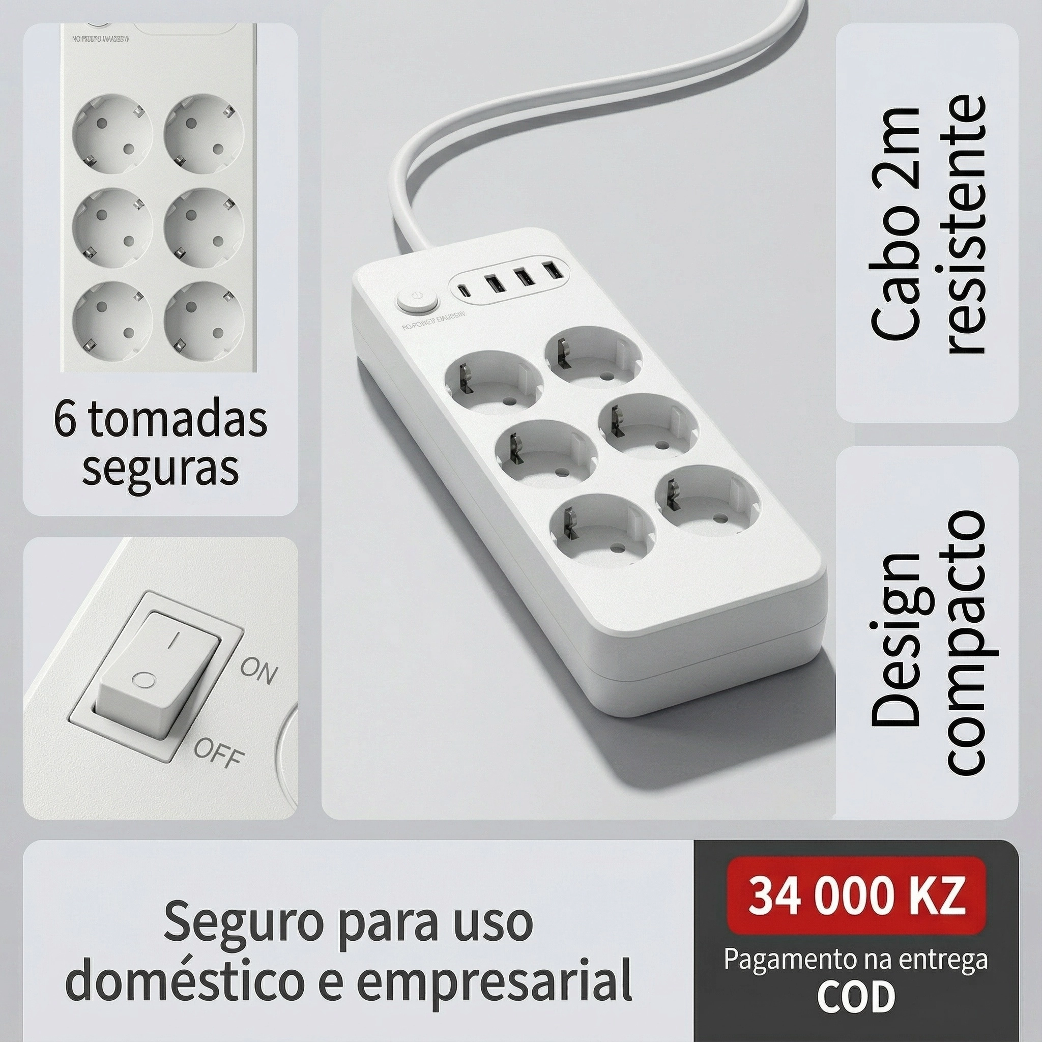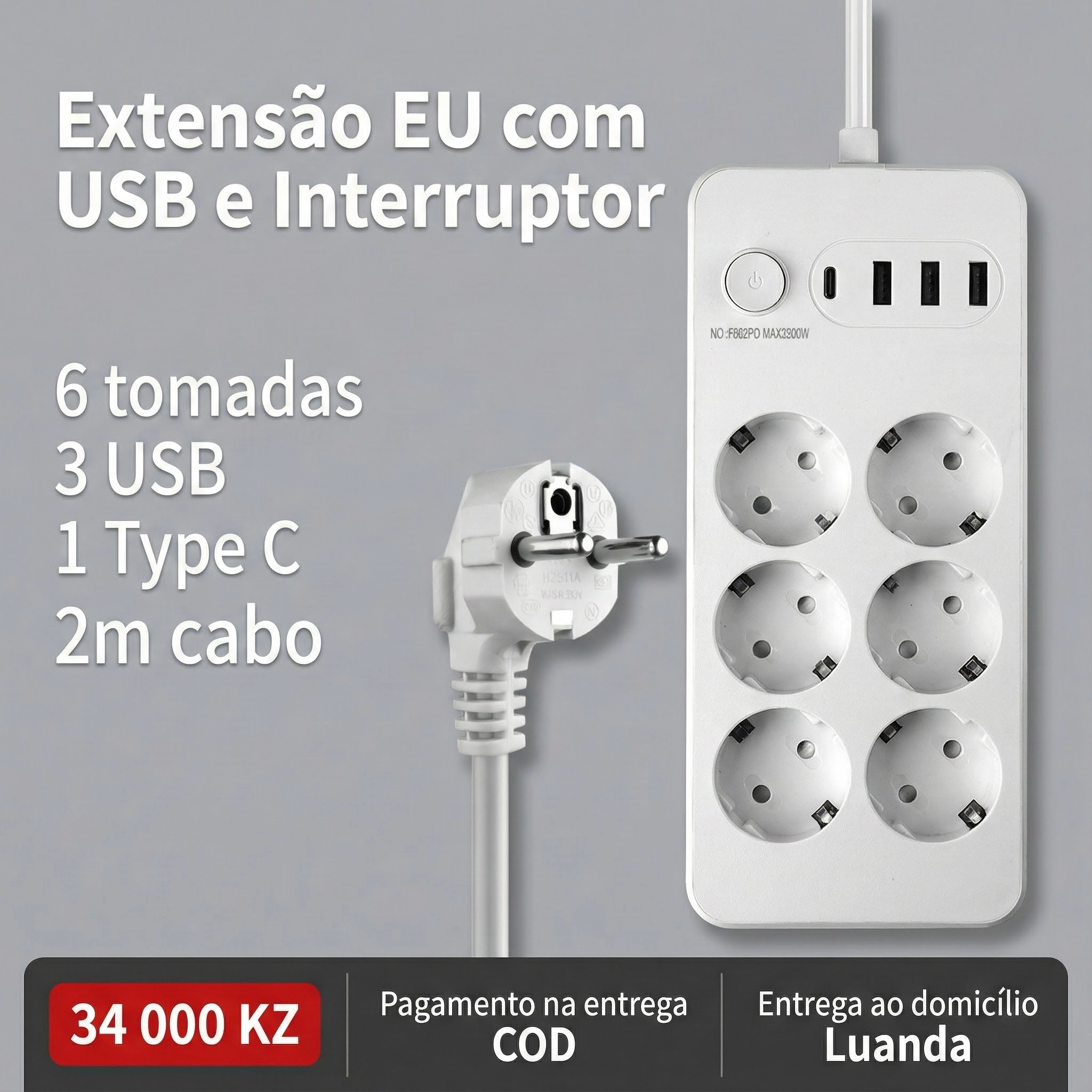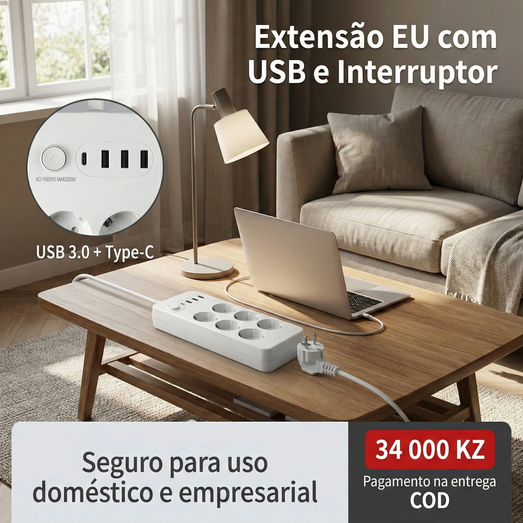 Extensão Elétrica Europeia com USB Interruptor Principal Cabo 2 Metros